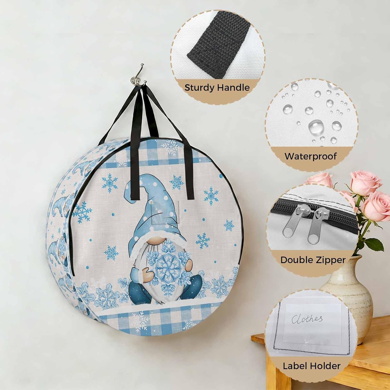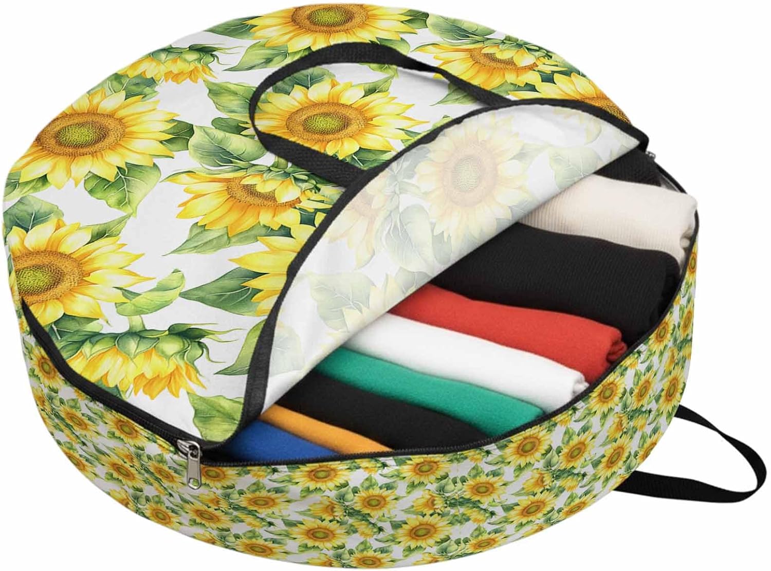 Reclaim Your Closet Space with the Round Storage Solution! Material: polyester Diameters: 24 inch, 30 inch, 36 inch Depth: 7 inches Package Includes: Round Storage Bag One Bag, Endless Possibilities: Whether you are swapping out your summer wardrobe, moving into a new dorm, or packing away holiday decorations, this bag has you covered. The circular design is uniquely suited for: Bedding: Comforters, quilts, sheet sets, and oversized pillows. Clothing: Winter coats, sweaters, and bulky ski gear. Home Decor: Holiday wreaths, garlands, and floral arrangements. Outdoor Gear: Camping blankets, sleeping bags, and beach towels. Dual Zippers: The high quality double zipper design allows the closet organizer to open wide from both sides, making it effortless to load and unload even the bulkiest comforters or wreaths. Reinforced Handles: Sturdy, reinforced handles are securely stitched to provide extra strength and a comfortable grip when carrying heavy loads or pulling the bag from under a bed. Clear Label Pocket: A transparent built-in label holder allows you to quickly identify the contents of each bag without ever having to unzip it, keeping your storage perfectly organized.